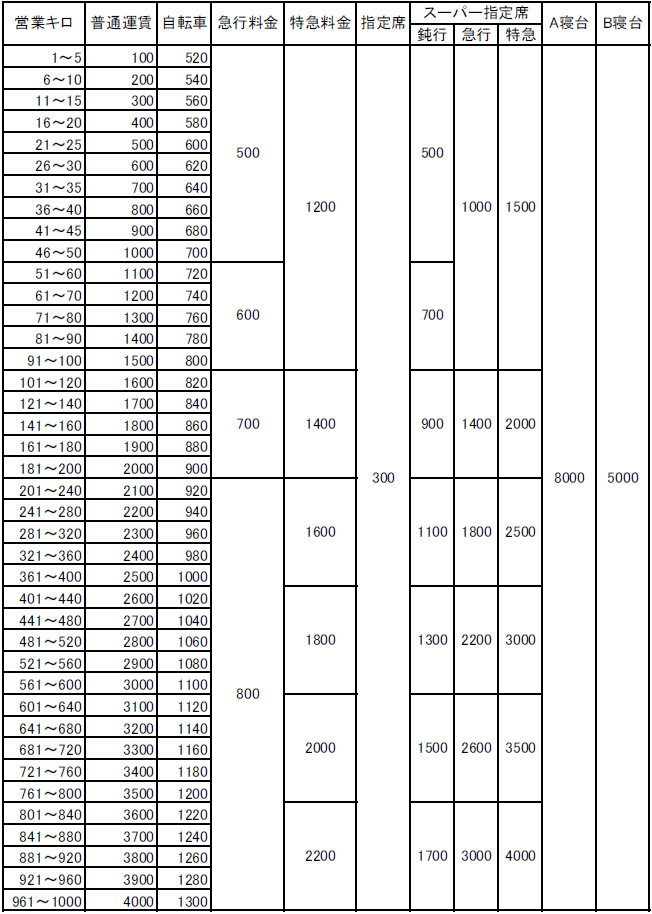 計算方法は、普通乗車券と同じで、「運賃・料金表」の「自転車」の欄を御覧下さい。